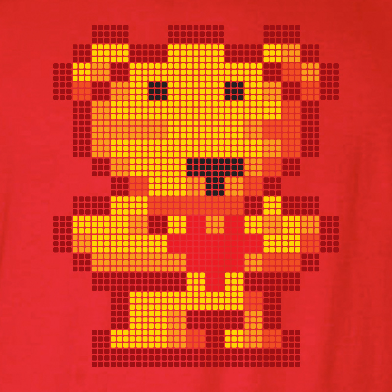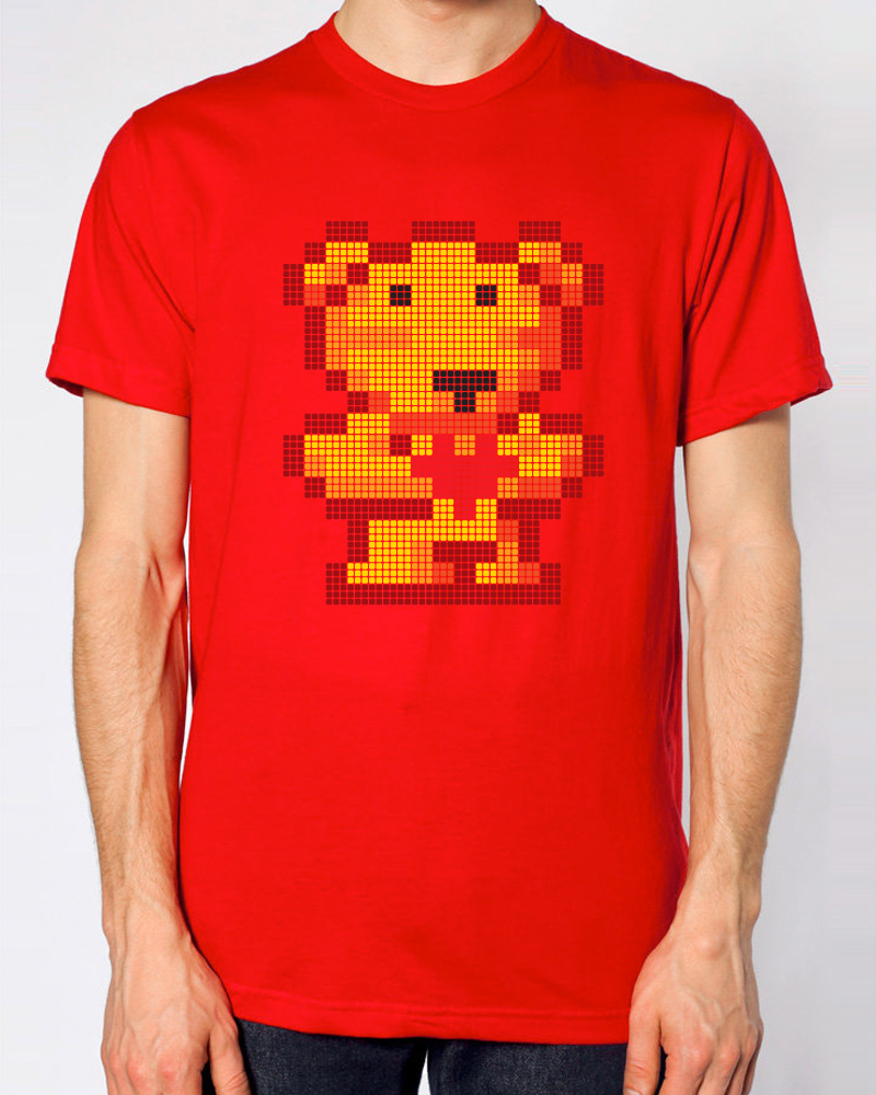 The Original Pixel-Bear design is 10 inches tall and 8.5 inches wide, centered on the front of American Apparel, "Red," super-comfy, 100% cotton crew neck tee; available in sizes XS thru 5XL. (4XL & 5XL are printed on Gildan tees)