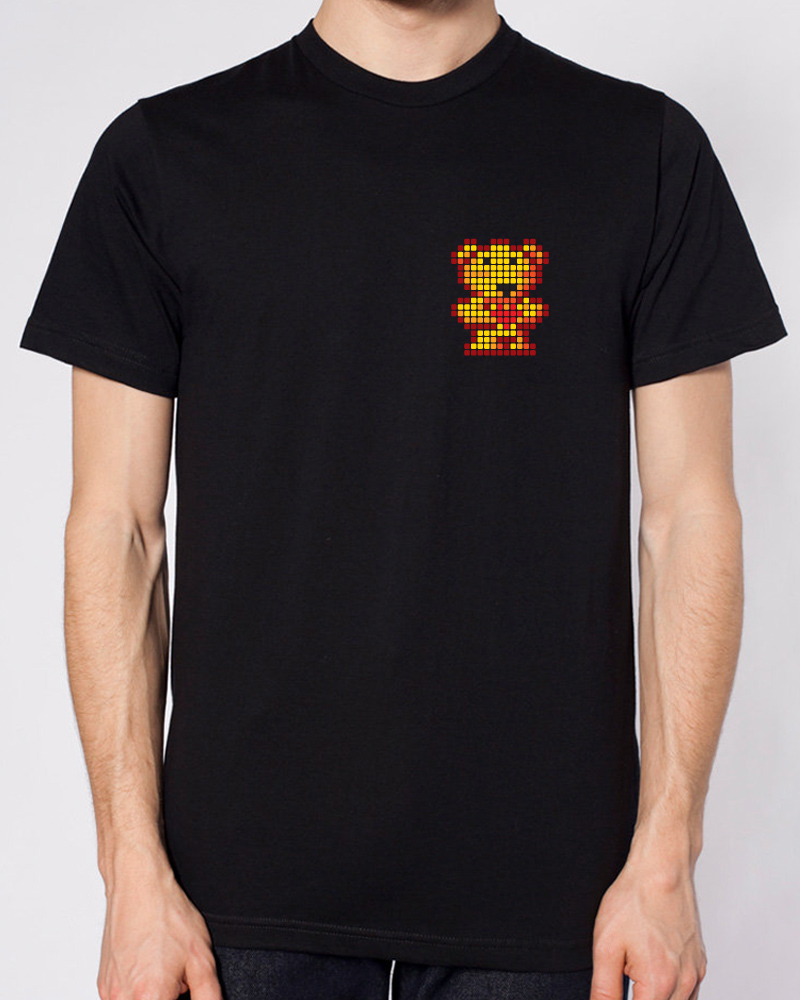The Pocket Pixel-Bear design is 3.5 inches tall and 3 inches wide, positioned where the pocket would be, on an American Apparel, "Black," super-comfy, 100% cotton crew neck tee; available in sizes XS thru 5XL. (4XL & 5XL are printed on Gildan tees)