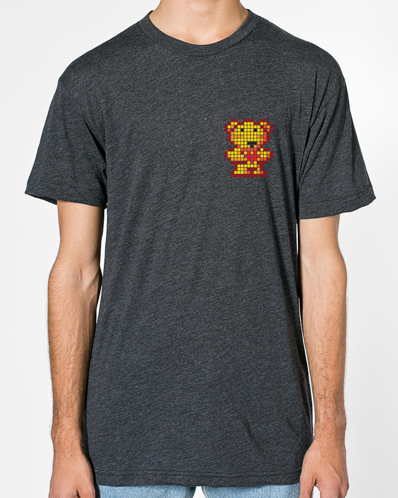 The Pocket Pixel-Bear design is 3.5 inches tall and 3 inches wide, positioned where the pocket would be, on an American Apparel, "Heather Black" super-comfy, 50/50 cotton/poly blend crew neck tee; available in sizes XS thru 2XL.