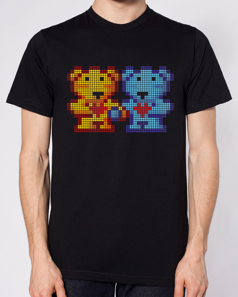 The Bearfriends Pixel-Bear design is 6-3/4 inches tall and 10 inches wide, centered on the front of American Apparel, "Black" super-comfy, 100% cotton crew neck tee; available in sizes XS, S, M, L, XL, 2XL, 3X. 4X and 5X are printed on comparable brand.