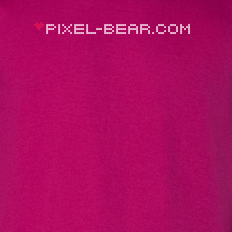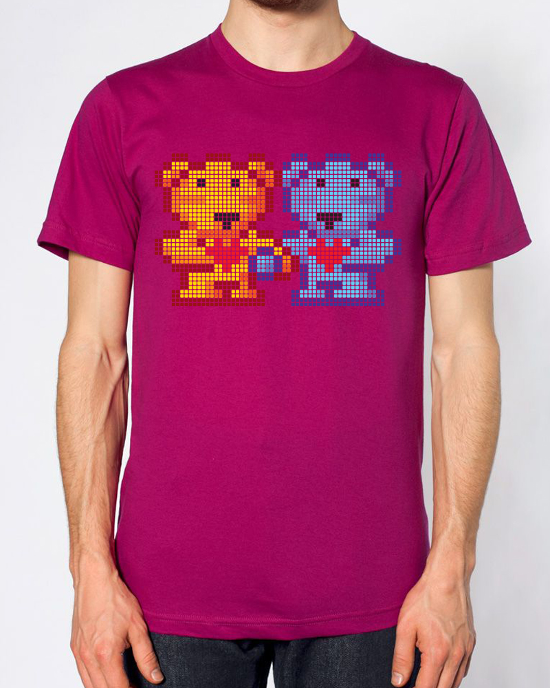 The Bearfriends Pixel-Bear design is 6-3/4 inches tall and 10 inches wide, centered on the front of American Apparel, "Raspberry" super-comfy, 100% cotton crew neck tee; available in sizes XS, S, M, L, XL & 2XL.